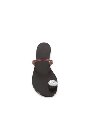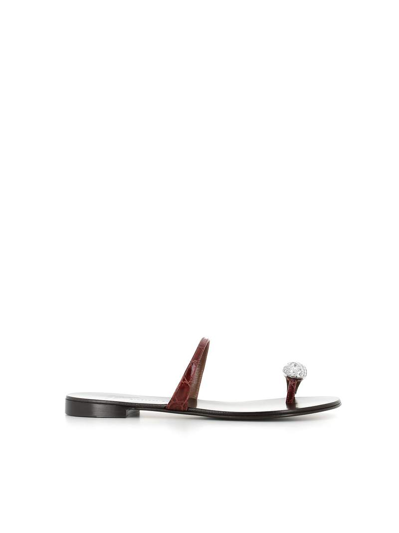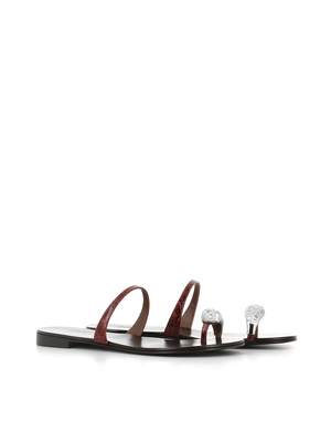 Women > Shoes > Sandals Dark brown women's leather jewel sandals by Giuseppe Zanotti, featuring a silver ring and a thin reptile-print strap. Leather sole. Heel: 1.5 cm. Composition: Leather.