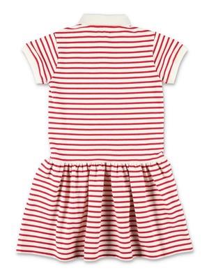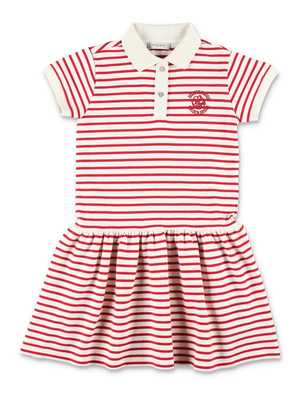 Girls > Clothing > Dresses The Golden Goose Striped Polo Dress combines sporty inspiration with an easy, feminine silhouette. Crafted from soft striped cotton, it features a flared shape with a gently gathered skirt that adds movement and lightness. The contrasting polo collar and front button placket reference classic sportswear, while the embroidered chest detail delivers an iconic Golden Goose signature. Short polo-style dress Horizontal stripe pattern Contrasting classic collar Front button fastening Short sleeves Lightly gathered waist Embroidered logo2 detail Composition: 79% cotton, 21% polyester.