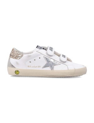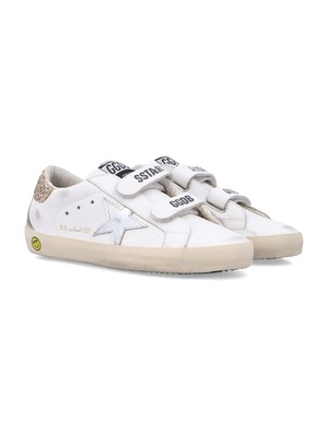 Girls > Shoes The Golden Goose Kids Old School Sneakers capture the brand's signature mix of craftsmanship and individuality. Made from smooth white leather, they feature a metallic star patch, glitter heel tab, and two Velcro straps with contrasting logo2. Finished with a rubber sole and vintage effect, they express the brand's effortless and distinctive style. White leather upper Metallic leather star patch Glitter heel tab Velcro straps with contrasting logo2 Logo label on tongue Rubber sole Vintage finish Composition: Upper: 95% cow leather, 3% polyethylene terephthalate, 2% cotton Lining: 39% cow leather, 39% cotton, 18% polyester, 4% polyurethane Sole: 100% rubber