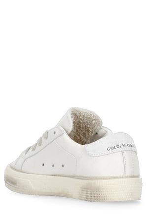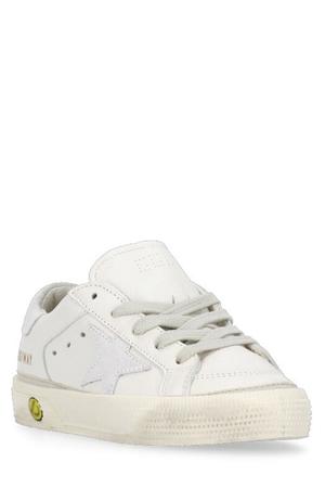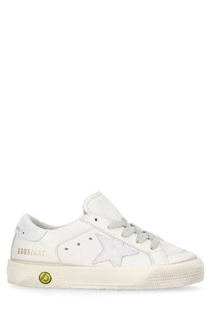 Kids Unisex > Shoes The May Star Patch Sneakers from Golden Goose Kids feature a mixed-material construction for comfort and durability. Composition: - Upper: 92% goat leather, 8% cow leather - Lining: 48% cotton, 27% cow leather, 12% polyester, 10% polyurethane, 3% viscose - Sole: 100% polyvinyl chloride