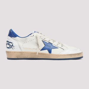 Golden Goose White and Blue Ball Star Sneakers. White leather upper, round toeline, lace-up fastening, blue heel tab with logo2, logo2 label on tongue, signature blue star logo2 on side, rubber sole, sneakers lettering on heels.