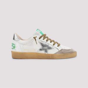Men > Shoes > Sneakers Golden Goose White goat leather Ballstar sneakers crafted in goat leather and cow leather. Round toe with grey detail, top lace-up fastening, green patch logo2 on the tongue, side signature grey star detail, side gold-tone lettering logo2, perforated details on the upper, back silver detail, back green logo2, brown rubber sole. Overused effect.