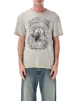 Men > Clothing > Topwear > T-Shirts The Vintage Print T-shirt by Golden Goose embodies the brand's signature worn-in aesthetic. Crafted from soft grey melange cotton jersey, it features a heritage-inspired front graphic with a deliberately faded finish. Distressed details and subtle imperfections enhance its authentic appeal, delivering a contemporary statement piece designed for effortless everyday styling. - Cotton jersey - Ribbed crew neck - Short sleeves - Vintage-effect front graphic print - Distressed details with worn finish - Regular fit Andrea is 1.90 m and wears size L. Composition: 100% cotton.