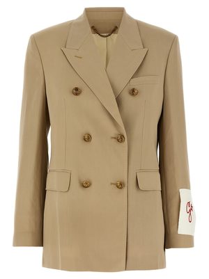 Double-breasted wool blazer with front heraldic button closure, viscose blend lining with written print, peak lapels, pockets, long sleeves with logo2 patch, side slits, and slightly padded shoulders. Composition: 100% virgin wool.