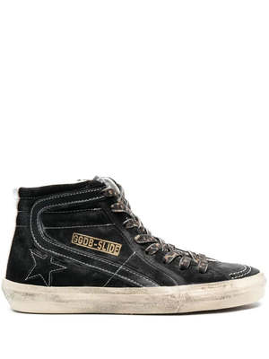 Venician brand Golden Goose is heavily inspired by the skating shoe silhouette in these Slide high-top sneakers. Designed in a neutral monochrome tone, this pair is equipped with the grunge style expected from the brand in the zip detailing and overall distressed look. Product Details Designer ID: GWF00115F00414690179 Color: Black/Silver Composition: Lining: Calf Leather 100%, Fabric 100%; Outer: Leather 100%, Fabric 100%; Sole: Rubber 100% Made in Italy