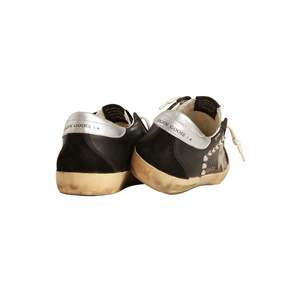 The Super-Star Leather Sneakers by Golden Goose are classic lace-up sneakers crafted in leather with a mixed black, taupe, and silver color palette.