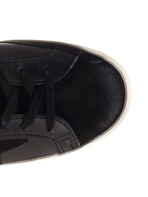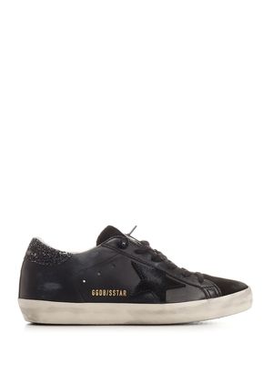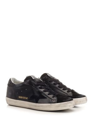 Women > Shoes > Sneakers 'Super-Star' sneakers in black nappa leather with vintage treatment from Golden Goose, featuring a black suede star and tongue, black glitter heel tab, and black laces. Composition: 64% Ovine Leather, 32% Cow Leather.
