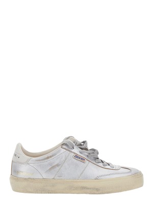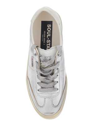 Women > Shoes > Sneakers Metallic low-top sneakers with round toe and front lace-up closure. Logo lettering on the tongue and on the heel. Laminated leather upper. Composition: 79% cow, 21% sheep.