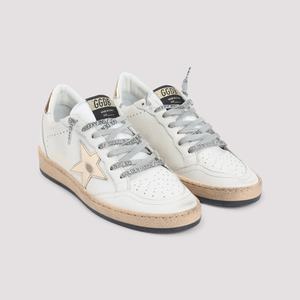 Golden Goose Ballstar Sneakers in Milk Gold. Crafted in cow leather and polyamide. Features a round toe, top perforated details, logo2ed lace-up fastening, contrasting black patch logo2 on the tongue, side signature gold star detail, side gold-tone lettering logo2, back gold-tone leather detail, back white logo2, and a beige and black sole.