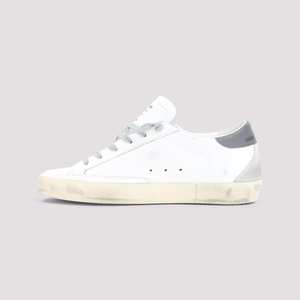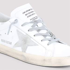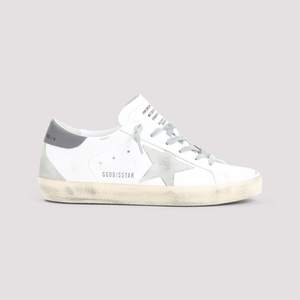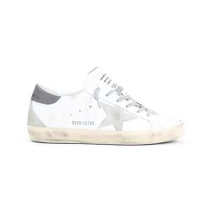 Women > Shoes > Sneakers Golden Goose white cow leather Superstar sneakers featuring a round toe, top lace-up fastening, logo2 patch on the tongue, silver side star, side lettering logo2, perforated details on the tongue, grey leather detail on the back, and a beige sole.