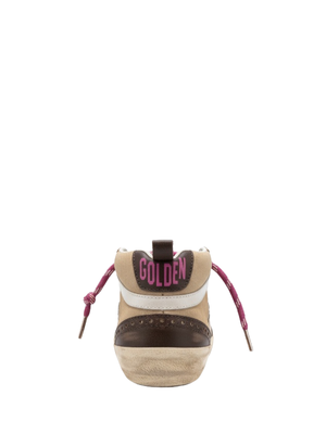 The Mid Star sneakers by Golden Goose take a refined approach to their Nineties skate scene inspiration. This women's model features a beige suede upper with a white star, a brown leather heel tab, and a white cotton flash. Pink laces complete the look. Product Details Designer ID: GWF00122.F008099.55639.FS Color: Brown/Beige/White Composition: Upper: 98% cow leather, 1% cotton, 1% polyethylene terephthalate; Lining: 55% cotton, 23% cow leather, 14% textile polyurethane, 4% polyester, 4% viscose; Sole: 100% rubber Made in Italy. Type: Shoes