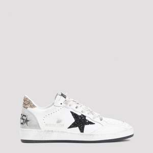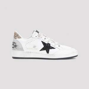 Women > Shoes > Sneakers Golden Goose White cow leather Ballstar sneakers crafted in cow leather, polyethylene, and a cotton blend. Features a round toe, top lace-up fastening, patch logo2 on the tongue, side black sequinned signature star detail, perforated details on the tongue, side gold-tone sequinned lettering logo2, gold-tone details on the heel, contrasting black logo2 on the heel, and a white rubber sole.