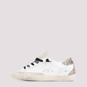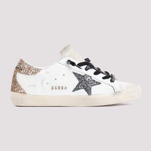 Women > Shoes > Sneakers Golden Goose Superstar optic white cow leather sneakers with a distressed effect, branded black lace-up fastening, round toe, logo2 tongue, glitter on signature side stars and heel, side logo2 and perforated details, branded leather insole, and rubber outsole.