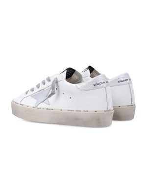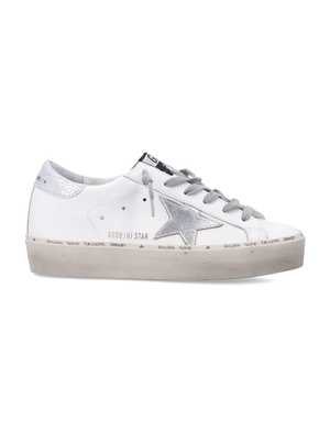 Women > Shoes > Sneakers The Golden Goose Hi Star elevates the iconic Super-Star silhouette with a double foxing sole for added height and attitude. This version pairs a suede star with a metallic silver heel tab, enhanced by hand-written lettering along the platform and delicate bead detailing at the back. A handcrafted style featuring the brand's signature crackle texture and vintage-effect finish. Details - Leather upper - Lace-up fastening - Metallic silver heel tab - Suede star - Golden Goose side signature - Rubber sole with vintage effect Composition - Upper: 95% cow leather, 5% goat leather - Lining: 60% cow leather, 40% cotton - Sole: 100% thermoplastic polyurethane