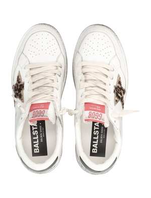 Women > Shoes > Sneakers The Golden Goose Ball Star women's sneakers capture 1980s American college style with a refined twist. Crafted from white leather, they feature a leopard-print pony skin star and a black laminated heel tab. Finished with white cotton laces and a hand-distressed vintage effect for a timeless, sporty attitude. - White leather upper - Leopard-print pony skin star - Black laminated leather heel tab - White cotton laces - Vintage hand-finished effect Composition: - Upper: 100% cow leather - Lining: 34% cotton, 31% cow leather, 24% polyurethane, 7% viscose, 4% polyester - Sole: 100% rubber