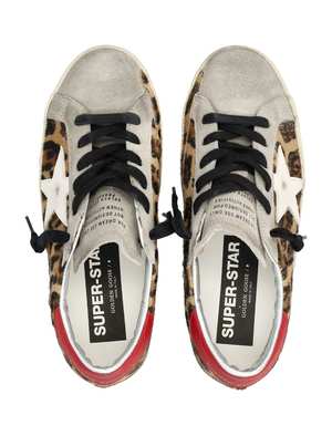 Women > Shoes > Sneakers Step into a bold, urban style with the Golden Goose Super-Star sneakers in leopard print. Crafted from premium suede and calf hair, these low-top sneakers combine signature distressed details with the standout star logo2. The contrasting red heel tab adds a touch of flair to this statement design. Suede and calf hair upper Signature white star detail on sides Contrasting red leather heel tab Distressed, worn-in effect for authentic style Lace-up closure Low-top silhouette Composition: Upper: 100% cow leather Lining: 41% goat leather, 31% cow leather, 18% polyurethane, 7% polyester, 3% viscose Sole: 100% rubber