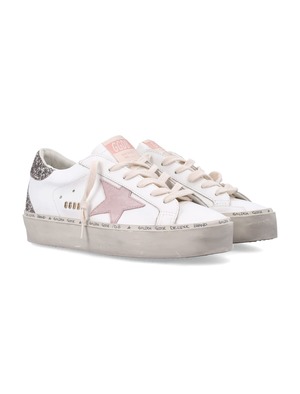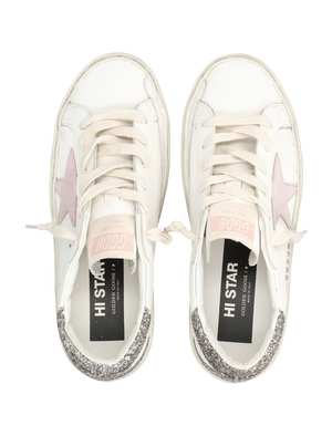 Women > Shoes > Sneakers The Golden Goose Hi Star sneakers combine Italian craftsmanship with signature sparkle. Crafted from white leather, they feature a pink suede star and a silver glitter heel for a refined yet playful look. The handwritten midsole detail and signature distressed finish make them an iconic symbol of effortless luxury. White leather upper Pink suede star patch Silver glitter heel tab GGDB branded tongue Raised sole with handwritten detail Distressed finish Composition: Upper: 88% cow leather, 9% polyethylene terephthalate, 3% cotton Lining: 41% cotton, 31% cow leather, 18% polyurethane, 7% polyester, 3% viscose Sole: 100% rubber.