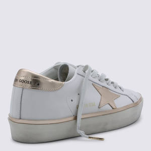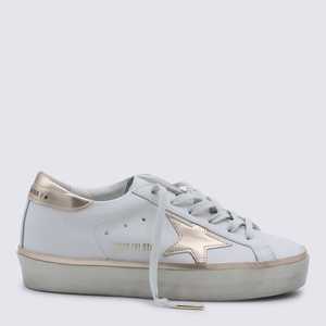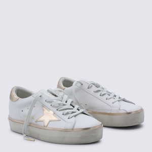 Women > Shoes > Sneakers White leather Hi-Star sneakers from Golden Goose featuring a round toe, cotton lace-up fastening, lateral logo2 signature, metallic silver heel tab and star patch, vintage treatment, and platform sole. Composition: cover 100% leather; sole 100% TPU.