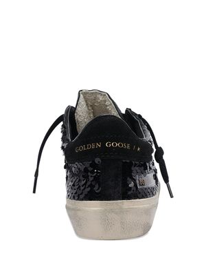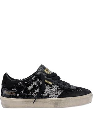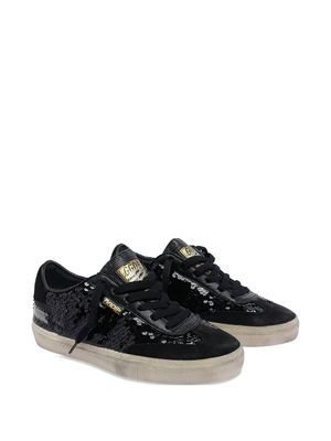 Women > Shoes > Sneakers Black sequin-embellished sneakers featuring a round toe, lace-up closure, and logo2 detail. Composition: Sheepskin; Polyethylene Terephthalate (PET); Rubber; Viscose; Polyurethane; Polyester; Calf leather.