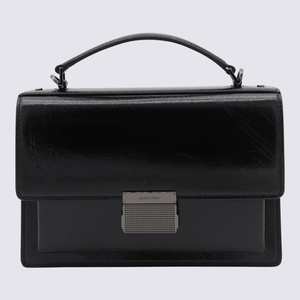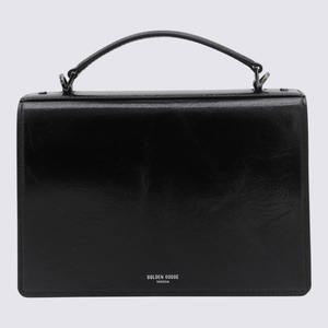 Black leather top handle bag from Golden Goose featuring a top handle, gold-tone hardware, logo2 detail, and pockets.