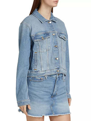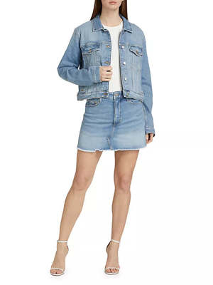 Crafted of comfort stretch denim, the Committed To Fit jacket from Good American features a classic silhouette including a spread collar, chest button-through flap patch pockets, side vertical welt pockets, and a button-front placket. - Spread collar - Long sleeves, barrel cuffs - Chest button-through flap patch pockets - Side vertical welt pockets - Button front Care guide 69% cotton/ 30% tencel/ 1% elastane Machine wash