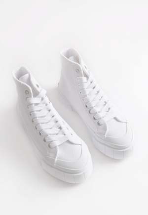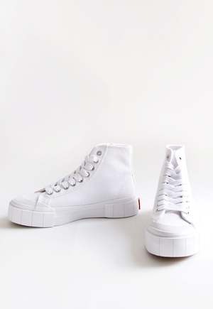 high top lace up sneakers. COMPOSITION sole - 20% recycled rubber, 80% natural rubber upper - organic cotton (GOTS certified) laces - organic cotton (GOTS certified) footbed - airfoam eco 20 - recycled gym mats & castor bean oil eyelets - recycled Metal Glue - eco glue - water based & chemical free MEASUREMENTS true to size ABOUT GOOD NEWS LONDON Good News is always striving to improve the environmental and social sustainability of their products by decreasing carbon, chemical and water footprint, whilst caring for the people who make their shoes. Good News will continue to ensure their materials are environmentally and socially progressive with fewer processes in production. Deadstock and faulty shoes are always donated to the refugees and homeless in need. Choose well, buy less, and make it last.