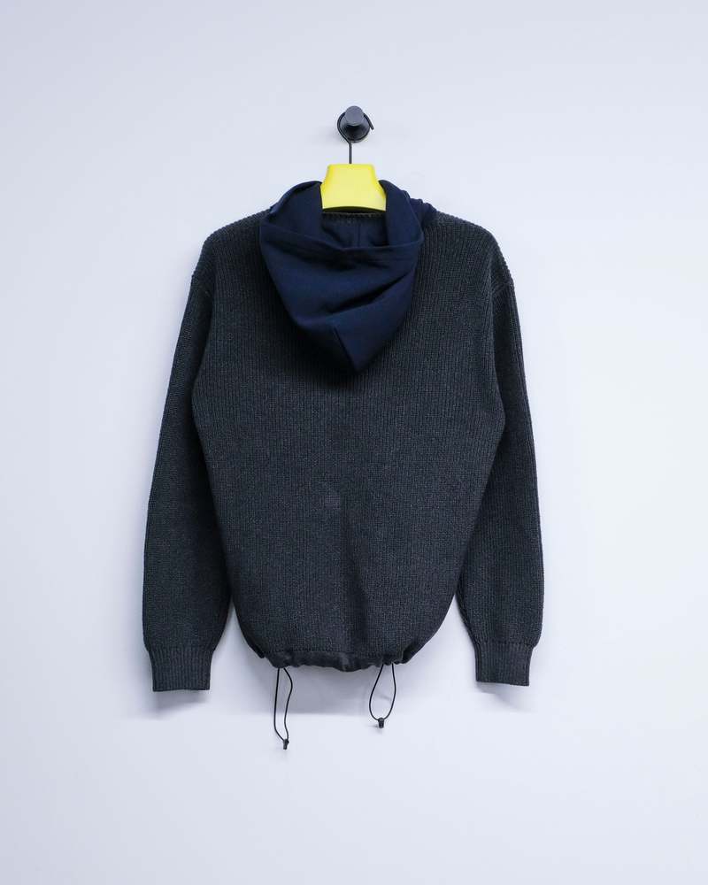 A fisherman rib knit sweater constructed in a cotton-acrylic blend, featuring a raw cut cotton jersey hood. Defined by a textured knit structure and an adjustable waist via Duraflex drawstrings.