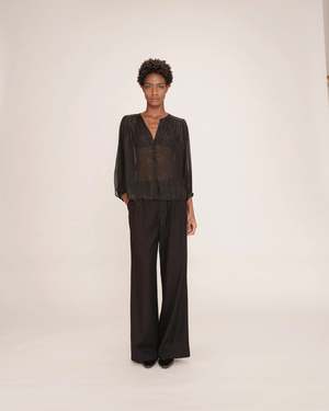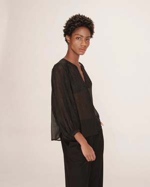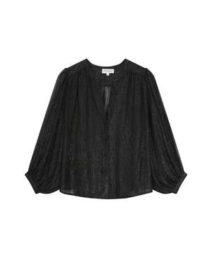 The Tarzy blouse by Grace & Mila features a sheer, lightweight, and shimmering lurex knit, a delicate detail that adds a touch of modernity and femininity. Both elegant and fluid, it can be worn with jeans, tailored trousers, or a skirt for a refined look. Description: - Straight cut. - Round neckline with a V-shaped slit. - Button fastening at the front. - Long puff sleeves with buttoned cuffs. - Gathers at the front and back yoke for a beautiful drape. - Color: Metallic black. - Choose your usual size. - Model is 1.76 m (5'9") and is wearing size 1 (S). - 100% polyester. - Delicate wash or hand wash.