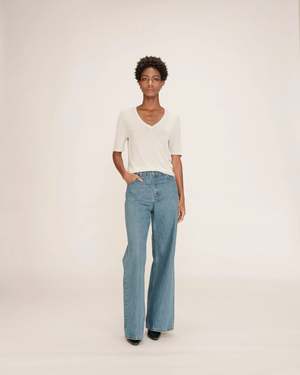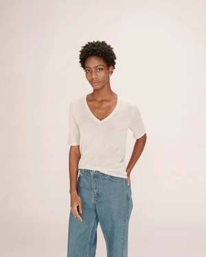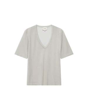 The Taylor knit tee by Grace & Mila is a wardrobe basic elevated with a touch of lurex for a luminous silhouette. Its straight cut and short sleeves are paired with a deep V-neckline to create a feminine and elegant look. - Straight cut - Deep V-neckline - Color: Silver - Take your usual size - Model is 176 cm (waist: 59.5 cm, hips: 87 cm) and is wearing size S - 82% viscose, 18% metallic fiber - Wash at low temperature or by hand