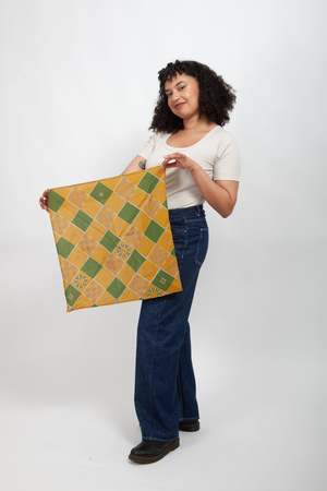 A lightweight cotton cloth with finished edges. 27" x 27" 100% cotton Printed with "Daffodils", a Gravel & Gold x Cassie McGettigan print from Spring 2020. Use this joyful square for a variety of functions: neckerchief, headband, head scarf, reusable wrapping paper, sack for lunch, or impromptu placemat!
