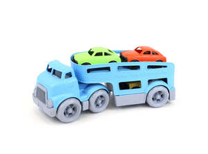 The double-decker Green Toys Car Carrier features two working ramps and space for three Mini Cars. With no metal axels or small parts, its great for both indoor and outdoor play, and encourages motor skill development and imaginative, creative play. The 5 piece set includes cab with detachable trailer and 3 brightly-colored Mini Cars. Each pint-sized car sports unique texture detailing for tactile stimulation, while the whole fleet features a super-eco design with no metal axles or external coatings. Made in the USA from 100% recycled plastic with no BPA, phthalates, or PVC. Dishwasher safe. Packaged with recycled and recyclable materials printed with eco-friendly inks. For ages 6 months and up.