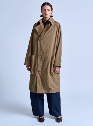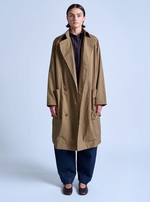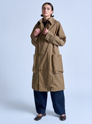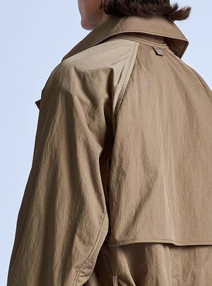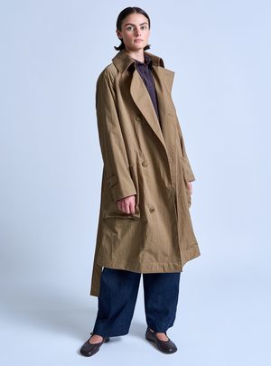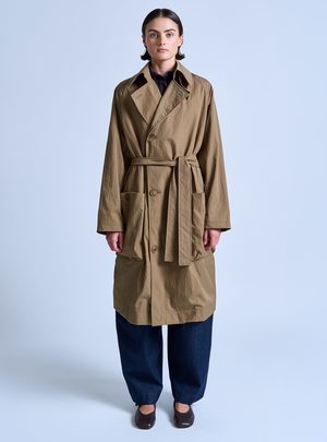 Rain or shine. The Peaked Lapel Trench Coat is water repellent, yet breathable, making it a stylish third piece even when it's not wet out. The fit is relaxed with tailored details. This outerwear piece comes equipped with raglan sleeves, two front sack pockets, an inside patch pocket, a belt that can be tied around the waist, storm flap, cuff straps, and a single back vent. Made in USA - Relaxed fit - 100% Nylon (Nylon twill fabric) - Trim: 56% Cotton / 44% Rayon - Water repellent - Raglan sleeves - Neck strap - Cuff straps - Back storm flap - Back vent - Inside patch pocket - Inside bound seams - Belt - Contrast binding inside - Grosgrain detail Model is wearing size S. She is 5'9" & wears a US size 2.