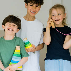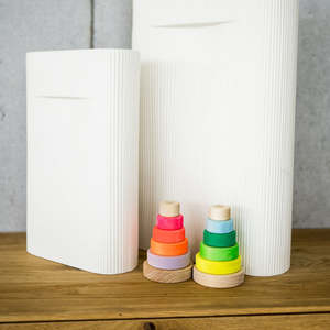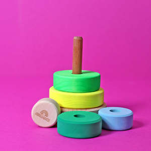 Grimm's is a German toymaker who makes wooden toys that focus on simplicity and beautiful coloring, making toys suitable for all ages. - Wooden conical tower with five discs for stacking - Teaches eye coordination and fine motor skills - Simple shapes and high contrast colors help develop and stimulate senses - Lime wood with non-toxic, water-based stains - Suitable for ages 1+ Height: 13 cm Wipe clean with a damp cloth.