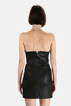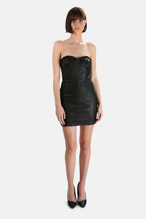 - Color: Black - Stretch leather - Mini length - Contoured fitted silhouette - Underwired cups - Ruffle trimmed bust - Back zip closure - Lined - 100% Leather - Lining: 95% Polyester 5% Elastane - Made in India - Style #: GRD32-H18 - Professional leather clean only * Model is 5'9" wearing size S Productcode GFF9-3 Designer GRLFRND