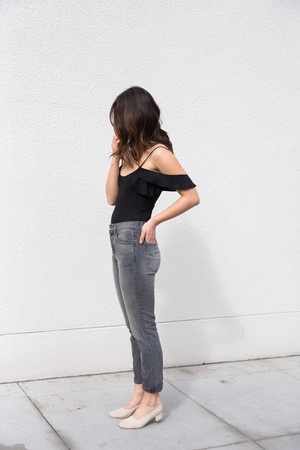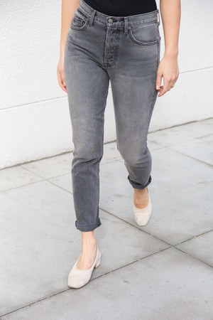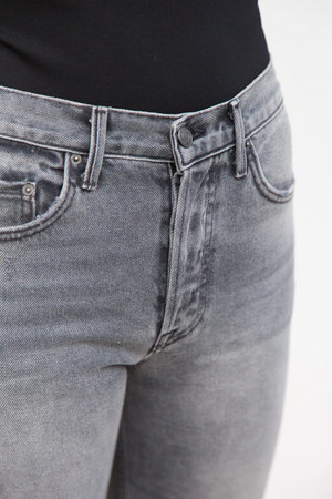 karolina high rise jean in montego bay by grlfrnd. + skinny leg, high waist, button fly + light distressing throughout, non-stretch + charcoal wash + 100% cotton + made in los angeles