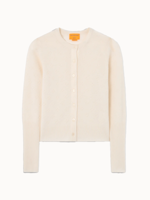 Light-weight cardigan in a textured popcorn stitch with high cuff rib trim and front button closure. Made from 100% cashmere.