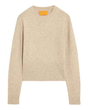 The Alina Crew in sand by Guest in Residence is a lightweight cashmere-silk knit sweater featuring a ribbed neck trim, hem, and cuffs, with signature GIR branding at the back of the neck. Perfect for transitional layering with jeans. Material: 75% Cashmere, 25% Silk Details: 7-gauge yarn, high rib hem for a sculpted look Model is wearing size Small. Type: Sweater.