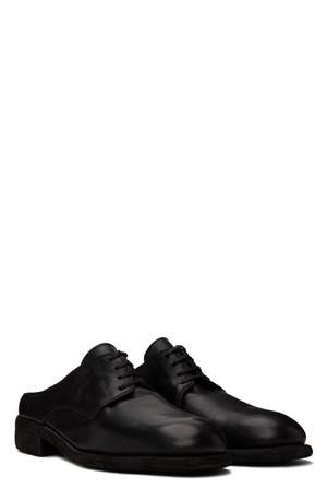Guidi is steeped in history and Italian craftsmanship established as Conceria Guidi Rosellini. Today Guidi is balancing tradition with latest technology with styles such as the Guidi 992SB Derby Black showcasing their expertise in leather and modern avant-garde design. Round toe. Tonal leather lace-up closure. Tonal stacked leather heel and sole. Tonal stitching. Treaded rubber Vibram outsoles included. Slip On Derby Mules style. Backless. Colour: Black BLKT. Composition: 100% Horse Leather. Handmade in Italy