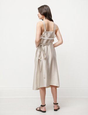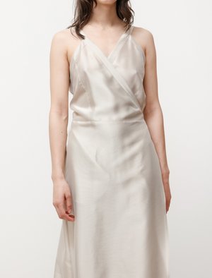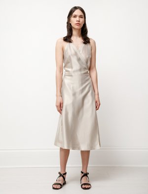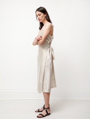An elegant dress with the perfect wrap waist and deep v-neck that's so incredibly flattering youll want to wear it all summer long. Cut from a semi-sheer, lightweight acetate blend with a gentle luster and beautiful weight, in a cool champagne tone. Wear this dress on its own or tie it a little looser as an added layer over your favorite pants and shirt a classic addition to your wardrobe no matter how you choose to wear it! - Made in Italy - 87% acetate, 13% polyamide - Hand wash cold - Fits true to size - Annapurna is 57; bust 30; waist 24; hips 34; wears a size x-small
