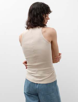 A classic ribbed tank with a long slim body and a higher crew neckline. The soft sand tone is a nice switch-up from classic white. Super soft and easy to wear this one will be a no-brainer all summer long. - Made in Italy - 90% Cotton, 10% Elastan - Machine Wash - Tallyn is 510; bust 31.5; waist 24.5; hips 34; is wearing a size 40