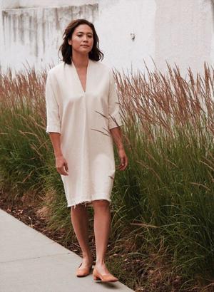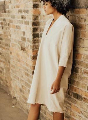 From Hackwith Design House Core Collection, this modern comfy wear-anywhere dress will be a go-to piece for many seasons. Featuring a structured fabric and relaxed fit, it's a piece you'll reach for and wear over and over again. - Color: Cream - Material: Denim 100% Cotton - V-neck neck detail in front and back. 3/4 Dolman sleeves. - Boxy loose fit. - Raw finished hemline. Hackwith Design House is an independent clothing line founded by designer Lisa Hackwith. Featuring handpick fabrics from all over the world and versatile designs, she creates beautiful basics, limited edition clothing and collaborates with multiple boutiques. With each piece created in her local St. Paul studio, Lisa is committed to producing timeless comfortable pieces that can be worn many seasons and become your favorite closet staples.