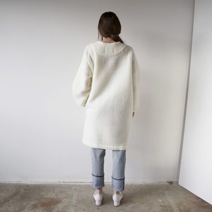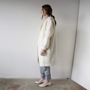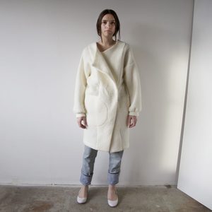 Mod jacket featuring an asymmetrical collar that contrasts its large, round pockets. Hits at the knees, and is secured with optional snaps.