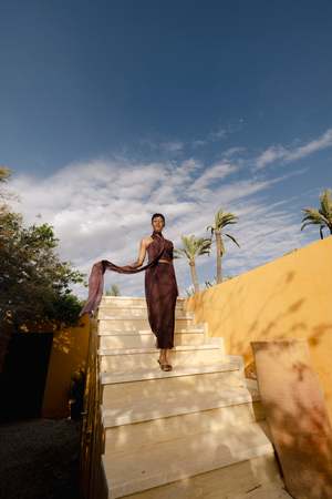 The Merzouga top features an asymmetrical, one sleeve design, with a long elegant scarf attached at the sleeve. Constructed with a high-quality chocolate brown mesh and lined bodice, the Merzouga top offers versatile styling options for a variety of fall/winter looks. Pair with the evil eye pants. Its 4-way stretch fabric ensures a comfortable and flattering fit. I designed this top specifically to wear in the Sahara dessert to keep me warm in the evenings and protective of the sun during the day while also maintaining modesty. We hope this piece adds to your wardrobe to brings you freedom to play, and leads you towards the pursuit of Sa'adah - long term life happiness and contentment.