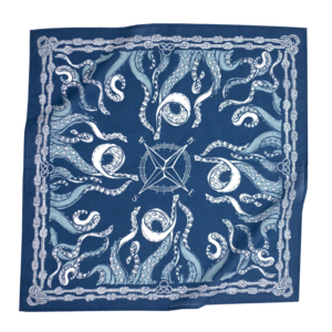 A classic bandana featuring the No. 070 Nautilus design in navy blue. Made from 100% premium cotton. Measures 22x22 inches. Designed in the U.S. and hand screen-printed in India. Bandanas can be used in many ways: as a handkerchief on hikes, worn in your hair or on your clothes, or tied around your pet's neck.