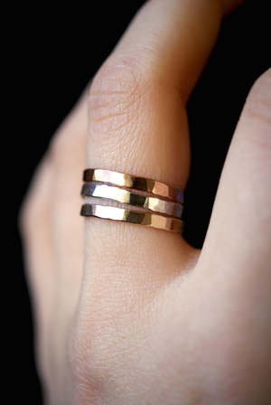 Extra thick hammered stacking ring. 2.25 mm thick. Available in 14k rose gold filled, 14k gold and sterling silver. Size 2-4 can be worn as a midi knuckle ring. Handmade in Portland, OR.