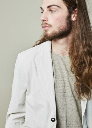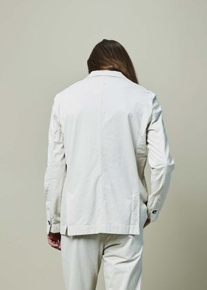 Hannes Roether's Vida Cotton blazer is crafted from soft cotton. Details - Single notch lapel with crossover top button loop closure. Two button front closure. - Flap pockets at the hip. Double vented back. Partially lined. Single button seamed cuffs. - Bound interior center back seam. Interior button loop slash, welt, and ticket pockets. - Shoulder 17.5", 20" chest, 36" sleeve length, 28" back length (approximately). - Dry clean. - Made in EU. Color bone. 98% cotton 2% elastane. Jacket runs true to size with tailored cut. Model is wearing a Medium, Ian is 6'1", 38" suit, 31 waist, 32 inseam.
