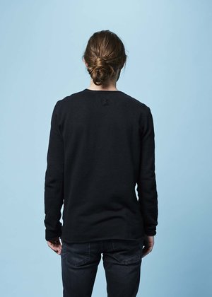 Hannes Roether's Laimer Knit Sweater is crafted from a knit cotton-linen blend and features curled hems. Details - Crewneck. Long sleeves. Pulls over. Surged seams. - Curled hems. Decorative upper hanger loop in back. - Shoulder 17.5", 21.5" chest, 28" length (approximately). - Hand wash. Hang dry. - Made in Portugal. Color black. 80% cotton, 20% linen. Sweater runs true to size. Model is wearing a Medium, Ian is 6'1", 38" suit, 31 waist, 32 inseam.