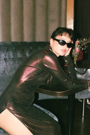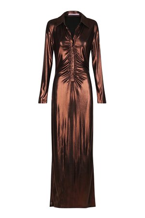 The Fallon Dress cut in the copper metallic fabric is a super flattering and fitted dress. Featuring a front button-up detail with an exaggerated collar and long sleeves and a light ruched detail before draping into a long skirt. With two high-cut side slits, this dress is the perfect combination of sexy and sophisticated. As seen on @megan__heaton, @morganlynziand, and @sierrabravee. - Deep V neckline. - Polo-style collar. - Button up front. - Ruched detailing. - Long sleeves. - Fitted at the bodice. - High-cut side slits. - Maxi length. - Unlined. - Color: Copper. - Metallic fabric. - Material: 100% Polyester. - Length is 56" (142 cm) for size S from the top of the shoulder to the hem. - Model is wearing size XS. - Model's measurements: Height 5'10.5" (180 cm)// Bust 32" (81 cm)// Waist 24" (61 cm)// Hips 35" (89 cm). - Fits true to size. - Designed in Australia. - Gentle cool hand wash separately inside out. Dry inside out in the shade. Cool iron on the reverse side. Do not bleach. Do not tumble dry. Do not soak. Do not wring. Extra care must be taken with a delicate fabric. Tear, pulls, and delicate fabric snags are not recognized as manufacturing faults.