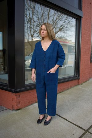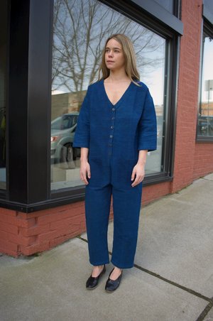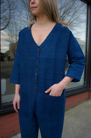 Double lined, comfortable cotton jumpsuit by Happy French Gang. Indigo dyed, heavier weight cotton. Homespun, handwoven 100% cotton. Sizing: S / M: Measures 42" around waist, measures 41" in length from underarm to hem. M / L: Measures 46" around waist, measures 43.5" in length from underarm to hem. Made in India