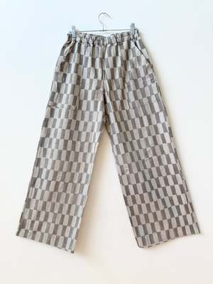Omar Pants by Happy French Gang are crafted from single-layered, light 100% natural hand-woven cotton. These pants feature an elasticated waist and two side seam pockets for comfort and practicality. Each pair is hand-block printed and dyed with indigo by artisans in a cooperative in India. The pants are preshrunk. Dimensions: Total waist relaxed: XS (64.5cm/25.2in), S (69.5cm/27.1in), M (74.5cm/29.3in), L (82cm/32.2in), XL (92cm/36.2in), XXL (102cm/40.1in) Outseam length from top to edge: XS (56.5cm/21.9in), S (57cm/22.1in), M (57.5cm/22.2in), L (58cm/22.4in), XL (58.5cm/22.6in), XXL (59cm/23in) Front rise from top edge: XS (24cm/9.44in), S (25.5cm/9.8in), M (27cm/10.6in), L (29.5cm/11.4in), XL (32cm/12.6in), XXL (34.5cm/13.4in) Back rise from top edge: XS (37cm/14.5in), S (38.5cm/14.9in), M (40cm/15.7in), L (43cm/16.9in), XL (46.8cm/18.1in), XXL (50.6cm/19.5in) Care: To maintain its beauty, cold hand wash separately with a natural detergent that does not contain citrus or acidic oil scents. Machine dry on low or hang dry out of direct sunlight. Note: Dark indigo pieces may bleed and stain other clothing if washed with other items or if they become damp from perspiration or rain. Wash separately or with jeans for the first few washes. This product has been dyed or block-printed using ancient techniques; colors may gradually change over time.